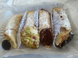 Panes redondos, felipes y flautitas, con las mejores artes de la panadería artesanal del sur italiano. Pizzas y focaccia. Taralli, rosquitas emblemáticas. Fressa o fressella, un pan seco circular y con agujero en el medio, que cuando se humedece con aceite de oliva puede convertirse en la bruschetta ideal. La tarta de ricota, la pastafrola. Los pastichotti con diversos rellenos y otros opus conforman su pastelería. Sfogliatella, que jamás faltan. Pero los que brillan como dioses indiscutidos los cannoli clásicos, como el de ricota y pistachos, aunque también otros más heterodoxos; para cualquiera que los pruebe la vida será otra, el después no tendrá fronteras. También un tiramisú único. Aceitunas y berenjenas preparadas al uso y costumbre de aquél sur italiano. Pastas secas y polenta blanca italianas, salsas de tomates, quesos, mozzarella y charcutería artesanal.