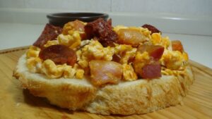 ¡Pito catalán! Cómo olvidar en estos días al creador de la lengua; quizás con esta receta: si son dos los comensales – pero recordad que donde comen dos, comen tres o…-, en zaragüelles o en basquiñas, qué más da del verbo dar; cuatro huevos gallináceos, panceta de chancho no importa si malevo o bonachón y chistorra, que si no la hay por tan manchega ella que es, pues entonces de la nuestra salchicha parrillera refocilada entre ajos y pimentón.