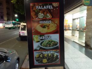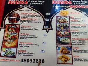 Donde una familia siria asentada hace siete años en Buenos Aires ofrece un notable shawarma y otros platos de la cocina árabe y armenia, como anuncian en su pequeño local sobre la calle Corrientes, la inefable y sobreviviente, entre el Abasto, dónde nació un tal Gardel, y Almagro, barrio de tangueros y futboleros pintados de azul, blanco y negro.