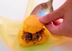Para la presentación: Elegir dos chalas y colocarlas en la mesa en forma de cruz. Colocar en el centro de la cruz una cucharada de pasta de maíz. Sobre la pasta colocar una porción de relleno y tapar con otra cucharada de pasta de maíz. Con los dedos mojados en agua, sellar los bordes de la pasta encerrando el relleno. Envolver esa tortita de maíz en las hojas e chala: primero en un sentido y después en otro para formar un paquetito prolijo. Atarlo con las tiras de chala reservadas.