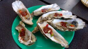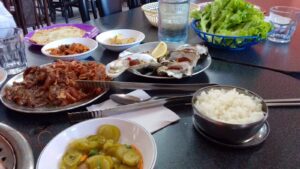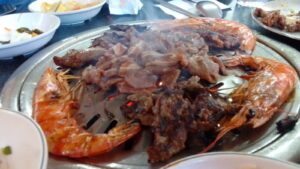 Y vuelve con aquello solicitado y los primeros pasos de una danza que parecerá interminable: bandejas con carnes desmenuzadas y marinadas para asar sobre el caldero instalado en el centro de cada mesa; platillos diversos con aderezos y vegetales, sopas picantes y de las otras, de kimchi, por ejemplo; pescados fritos – eran pescadillas – bandejas con langostinos enteros y ostras en su concha con salsa de leve picor; otras con hojas de lechuga, para envolver las carnes que se fueron caldeando y así, las veces que el comensal lo solicite; es decir una suerte de tenedor libre coreano.