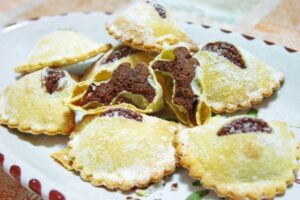 De vuelta a Italia, esta vez a la Toscana. Una preparación milenaria que se remonta al Renacimiento es la del jabalí en “dolceforte”, un guiso aderezado con una salsa a base de chocolate negro, frutas confitadas, pasas, piñones y vinagre. Particularmente difundida en Siena y Florencia, esta salsa era uno de los puntos culminantes de los banquetes nobles, y también se utilizaba para acompañar otros platos como la liebre estofada (…).