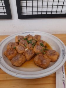 Pasamos entonces a una suerte de pequeños buñuelos de tofu rellenos con carne, crocantes por fuera y absolutamente increíbles, fuera de serie; y nos comentaron que también los preparan con otros rellenos, para comensales que mal se llevan con el comer carnívoro. Continuamos con uno de mis preferidos, tanto que necesito volver a encontrarme con él. Lo llaman salteado del monje. Es a base de vegetales y apto para veganos. Estos son los sabores que le descubrí: algas, zucchini, zanahoria y unos hongos maravillosos. Imposible desmenuzar qué especias, ese es el alto secreto de Juance.