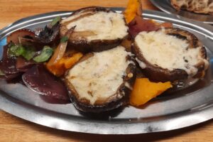 Optamos por dos medias porciones (se puede pedir media o una entera) del área parrilla: Portobellos rellenos y Gírgolas grillados. Los Portobellos venían rellenos con queso sardo estacionado y pimienta negra y se acompañaban con boniatos asados con miel y mostaza.