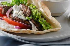 En el centro del pan pita, colocar los trozos de carne de un pincho. Agregar aros de cebolla morada, rodajas de pepino agridulce, perejil picado, las papas al horno y trozos de queso de cabra o feta. Regar con la salsa y envolver con el pan. Servir y disfrutar.