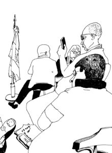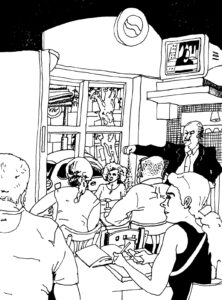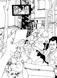 Página tras página y no desde fuera, desde el otro lado del vidrio, en Bloc 2 Biografía de una mirada, su más reciente libro (Paradiso; Buenos Aires; 2023), los dibujos y las fotos de Adriana Yoel nos hablan sí de nuestros cafés – al menos así los oigo –, pero con esbozos o trazos que hasta pueden ser efímeros porque son memorias – ¿efímeros… acaso la memoria no es lo único que sobrevive?-; por suerte ella se encarga de ayudarnos – a mí me ayudó – con algunos textos que recoge al pasar.