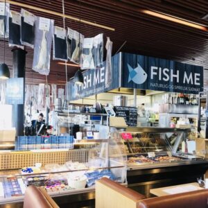 Tomamos el tranvía para ir hasta el Mercado de Pescado de Bergen o Fisketorget, que es uno de los lugares más visitados de la ciudad. Un muy agradable paseo por el muelle: está lleno de puestos de comida (pescado y mariscos casi todos), aunque también hamburguesas y salchichas. Pero la lluvia nos privó de comer allí y tuvimos que cruzar la calle, y entrar en Bryggeloftet & Stuene Restaurant.