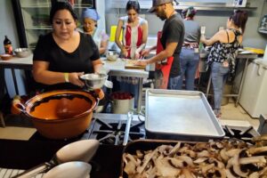 “La intención es hablar de ellos desde un lugar de vida”, dijo Zahara Gómez, editora del proyecto, y así fue. Unas quince personas respondimos al llamado del Centro Cultural España para compartir la cocinada con dos mujeres buscadoras: Cecilia Aguirre, quien busca a su hijo Óscar Miguel Ángel Flores Aguirre, y Yoha García, quien busca a su sobrino Jonathan Alan García Hernández.