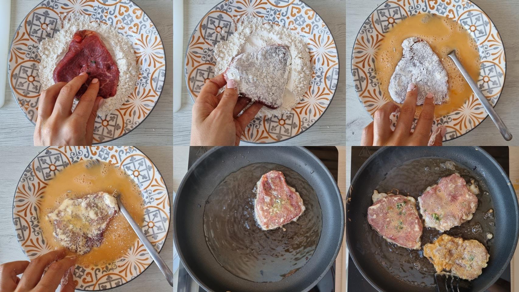 El primer paso consiste en salpimentar los filetes. Luego se toma algo de la manteca y se la pone a derretir en una sartén junto con un chorro de aceite; y cuando esté bien caliente se fríen los escalopines durante unos pocos minutos, hasta que estén dorados…Se colocan en un plato.