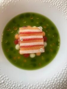 Me hubiera gustado algo más que la combinación de camarones de San Remo, melón, pepino, sandía, con aguachile mexicano (agradable, fresco, efectivo), o la langosta, durazno y espuma de verbena (agradable, fresca, etc….