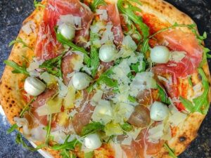 ¿Los ingredientes elegidos? Tomates asados, jamón crudo, rúcula, mozzarella de búfala, hojas finas de queso grana padana y aceite de oliva extra virgen.