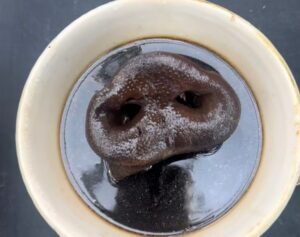 Pequeña cocota de terracota que contiene un líquido marrón del que emerge el hocico de un jabalí. Consciente de la polémica que se generaría, Redzepi acompañó el Reel publicado en su perfil de Instagram con la pregunta: De la cocina no estamos seguros: ¿Podrías comerte el hocico?