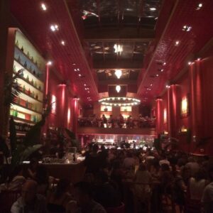 Un galpón gigantesco, tan rojo colorado todo y con tanta luz de esas que exageran la falta de luz, y con un retumbar permanente de voces y parloteos sin suspiros siquiera, que al rato no se oye nada, ni tampoco se ve y el techo y las paredes con resplandores linfáticos a los pobres comensales se le derrumban sobre sus testa.