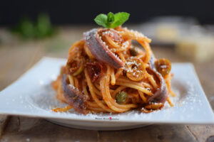 Agregar entonces la anchoa asada desmenuzada – ojo, quitarle todas las espinas-, cierta abundancia de tomates triturados y también de vino blanco, de aceitunas negras picadas y de alcaparras. Dejar la salsa a fuego bajo/medio durante media hora, con cuidado de que no espese demasiado. Si ello sucede añadir un poco de agua.