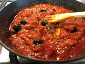 ¿Algo parecido a la putanesca, no?…Pues bien, con vino tinto y por la fogarata, ¡salud!