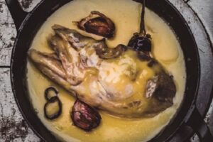 La del tío Mero no bastaba, quería yo más furia y me acordé de otra receta sin parientes, que ellos quedasen para mañana: con un balero o marulo – cabeza que le dicen – de ternera descarnada, hervido en humedades de cebollas, clavos, pimienta negra, zanahorias, puerros, romeros y las yerbas que nos hayan quedado por ahí; y, para la salsa hija de un salteado meticuloso y por turnos, grasa de esa que se usa para las buenas empanadas, cueros o recortes de jamón a mangarle por poca guita al fiambrero, más cebollas, tomates pelados, pan frito y así de azúcar.