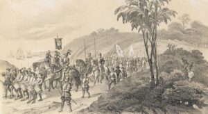 Así como se adornaba a las aves con sus plumas para presentarlas a los comensales de un banquete, un cocinero experto y bastante ogro habría vestido las testas con sus mejor acondicionadas pelucas. No les faltaba más que una orla de hojas de lechuga o de rábanos abiertos en flor de lis. Por lo demás, los potes de espuma arábiga, las botellas de agua de lavanda y las cajas de polvos de arroz, vecinas de las cazuelas de mondongo y de las bandejas de riñones, completaban, con singulares coincidencias de frascos y recipientes, aquel cuadro de un abominable convite. Había abundancia de cabezas aquella mañana, ya que, al lado de la tripería, el librero había colgado de un alambre, con grapas de lavandera, las últimas estampas recibidas de París. En cuatro de ellas, por lo menos, ostentábase el rostro del rey de Francia, en marco de soles, espadas y laureles. Pero había otras muchas cabezas empelucadas, que eran probablemente las de altos personajes de la Corte.