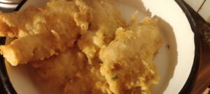 Medio kilo de filetes de mero; harina de garbanzos; dos huevos; un algo de sal, pimienta molida y ajo y perejil bien picados; aceite de girasol.