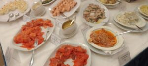 Llegó el momento de las estrellas, que no habitan en ningún cielo sino que se ofrecen a sí mismas sobre una mantelería blanca, impecable. Son los platos fríos: salmonetes ahumados; lachas, que son bocados de pescados que reemplazan al arenque, marinados, a la crema y a la mostaza; huevos rellenos con caviar de arenque; una ensalada para el recuerdo, de repollo blanco, curry y uvas pasas, y otras agridulces variadas, como variados lo quesos y otros bocadillos.