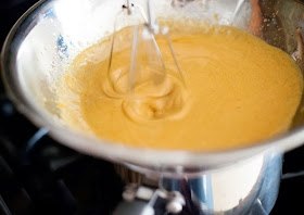 Con una cuchara de madera bate las yemas con el azúcar hasta que estén casi blancas, luego agrega el líquido, mezcla bien y coloca a fuego alto y en baño de María, revolviendo constantemente y con cuidado de que la mezcla no hierva.