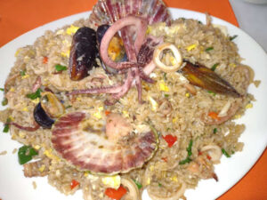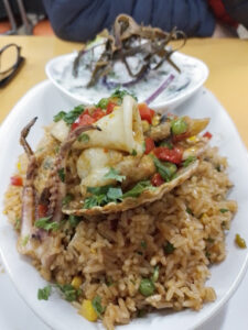 Ceviche mixto, con su leche de tigre justa, en serio, inolvidable; arroz chaufa con mariscos y chicharrones, que son frituritas de pescado; salsas picantes aparte y un platillo con batatas fritas…¡Ay qué ganas de seguir comiendo…pero por favor, tomateros, compostura…!