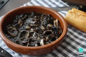 A saltear la cebolla muy pero muy picada y la dejemos hasta que se ablande para luego añadirle el tomate; que se forme un sofrito espeso. Luego agregamos las rodajas de calamar, el vino, la sal y la pimienta. Cocinamos en olla tapada durante 30 minutos y añadimos la tinta. Removemos bien y mantenemos la cocción durante unos 15 minutos más, con la olla destapada. Con el ajo, perejil y algo de pan frito preparamos un mejunje para incluirlo en nuestra cocción apenas finalizada.