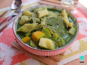 PREPARACIÓN: Dorar la cebolla en el aceite, añadir las zanahorias, nabo, puerro, apio, repollo y zapallito, todo cortado en dados. Rehogar las verduras y agregar un poco de caldo o agua. Condimentar y sumar los porotos semicocidos. Hervir 1 hora a fuego bajo.